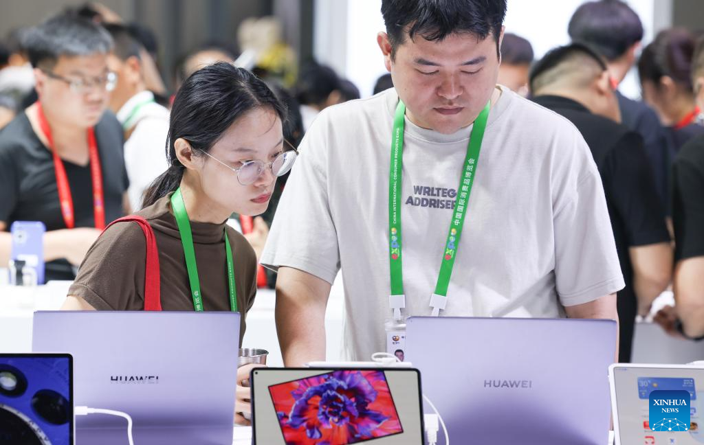 People visit the booth of Huawei at the fourth China International Consumer Products Expo (CICPE) in Haikou, capital city of south China's Hainan Province, April 14, 2024. A batch of domestic brands have attracted a lot of visitors at the expo. (Xinhua/Yang Guanyu)
