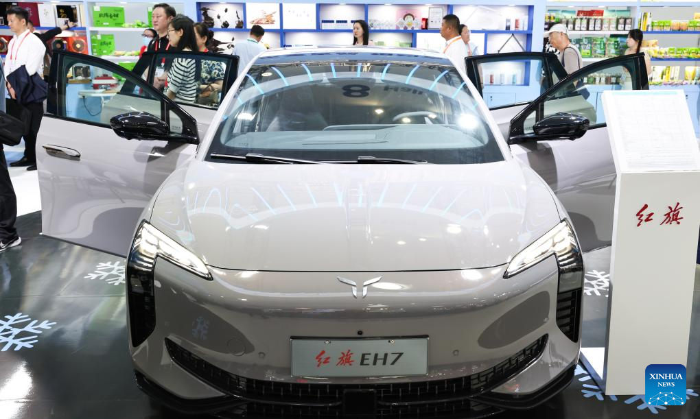 A new energy vehicle of China's car brand Hongqi is displayed at the fourth China International Consumer Products Expo (CICPE) in Haikou, capital city of south China's Hainan Province, April 13, 2024. A batch of domestic brands have attracted a lot of visitors at the expo. (Xinhua/Yang Guanyu)