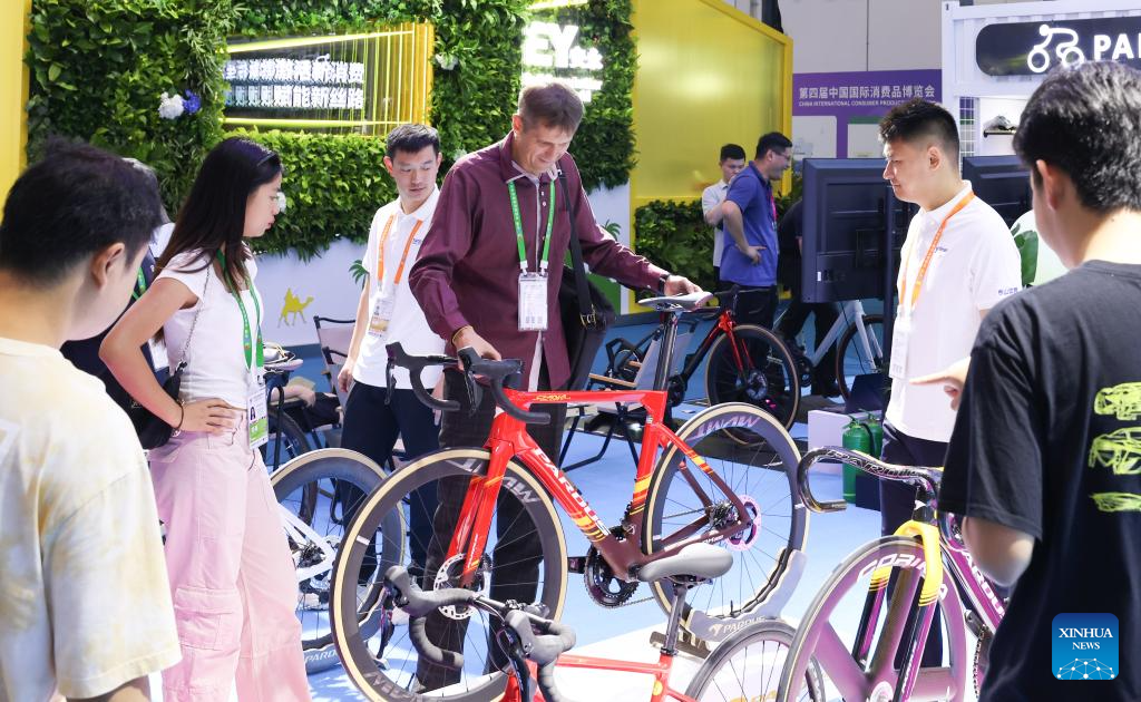 Visitors view a carbon fiber bicycle at the fourth China International Consumer Products Expo (CICPE) in Haikou, capital city of south China's Hainan Province, April 14, 2024. A batch of domestic brands have attracted a lot of visitors at the expo. (Xinhua/Yang Guanyu)