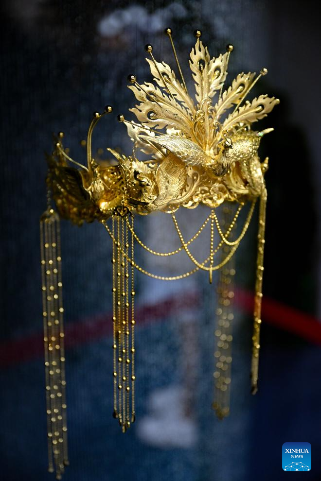 A gold coronet is displayed at the fourth China International Consumer Products Expo (CICPE) in Haikou, capital city of south China's Hainan Province, April 13, 2024. A batch of domestic brands have attracted a lot of visitors at the expo. (Xinhua/Guo Cheng)