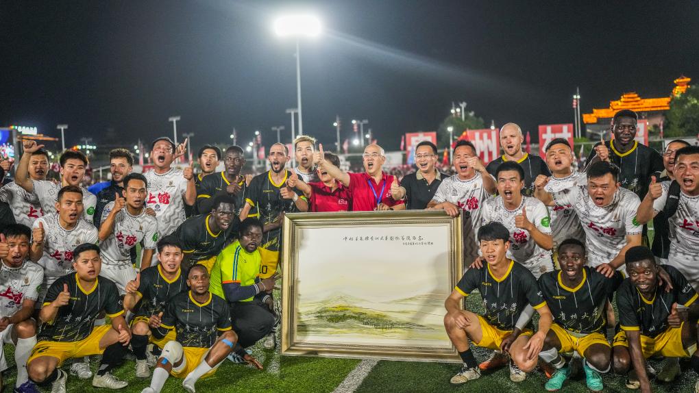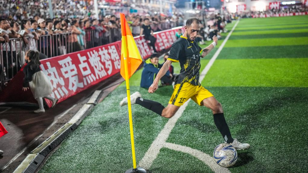 International students from Guizhou University perform during a friendly football match in Rongjiang County of southwest China's Guizhou Province, April 13, 2024.(Xinhua/Tao Liang)
