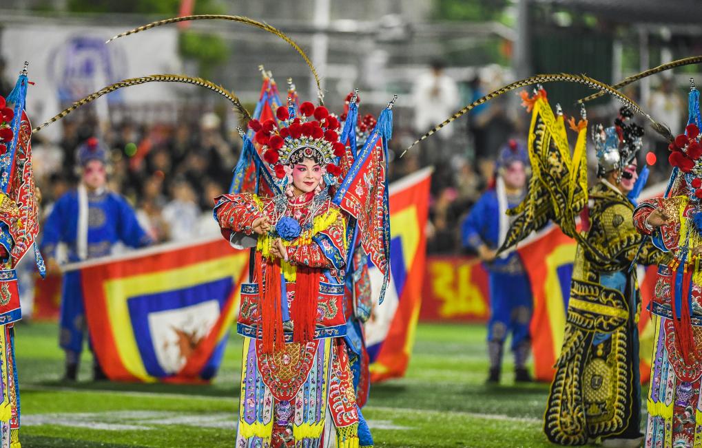 International students from Guizhou University greet spectators after their performance during a friendly football match in Rongjiang County of southwest China's Guizhou Province, April 13, 2024.(Xinhua/Tao Liang)