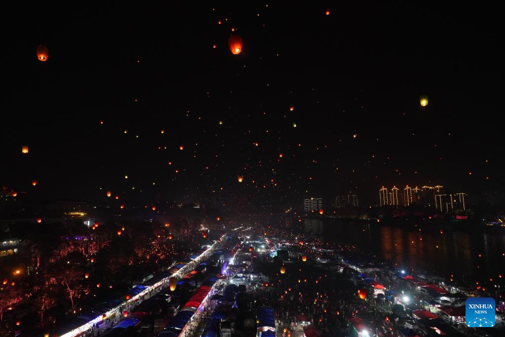 People fly Kongming lanterns, a kind of small hot-air paper balloon, by the Lancang River in Jinghong City, southwest China's Yunnan Province, April 13, 2024, to celebrate the New Year of the calendar of the Dai ethnic group. (Xinhua/Dong Bohuai)