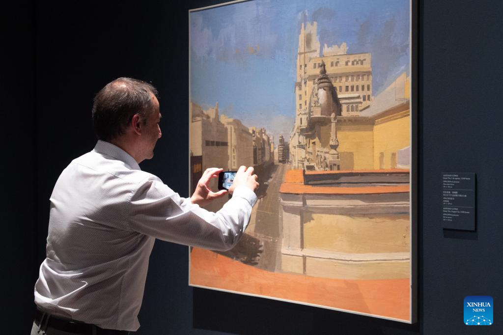 A visitor views an exhibition featuring contemporary oil paintings from China and Spain at Palacio Real, in Madrid, Spain, on April 12, 2024. (Photo by Gustavo Valiente/Xinhua)