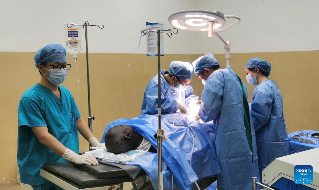Cheng Xiaojian (2nd R), Ren Huaibin (2nd L), Wen Hui (1st R) and Wang Yunsan (1st L), members from the 11th batch of Chinese medical team to South Sudan, perform a surgery at Juba Teaching Hospital in Juba, South Sudan, on March 27, 2024. The 11th batch of Chinese medical team to South Sudan has been providing medical services at the Juba Teaching Hospital since September 2023. As of early April, 2024, the medical team had provided 6,873 outpatient and emergency services, completed 82 surgeries, organized six free treatment event, and provided professional training for over 1,100 local medical personnel. (Xinhua/Han Xu)