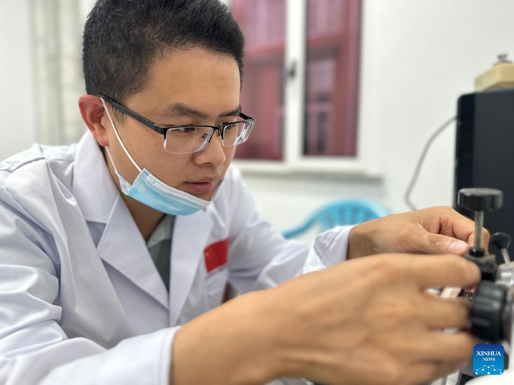 Huang Yonggang, a doctor from the 11th batch of Chinese medical team to South Sudan, conducts a sample test at Juba Teaching Hospital in Juba, South Sudan, on Sept. 21, 2023. The 11th batch of Chinese medical team to South Sudan has been providing medical services at the Juba Teaching Hospital since September 2023. As of early April, 2024, the medical team had provided 6,873 outpatient and emergency services, completed 82 surgeries, organized six free treatment event, and provided professional training for over 1,100 local medical personnel. (Xinhua/Han Xu)
