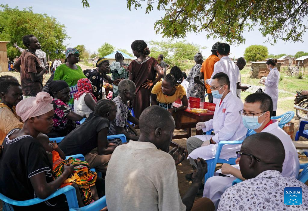 Doctors from the 11th batch of Chinese medical team provide free treatment for people in Nakitun Village, Juba, South Sudan, April 10, 2024. The 11th batch of Chinese medical team to South Sudan has been providing medical services at the Juba Teaching Hospital since September 2023. As of early April, 2024, the medical team had provided 6,873 outpatient and emergency services, completed 82 surgeries, organized six free treatment event, and provided professional training for over 1,100 local medical personnel. (Xinhua/Han Xu)