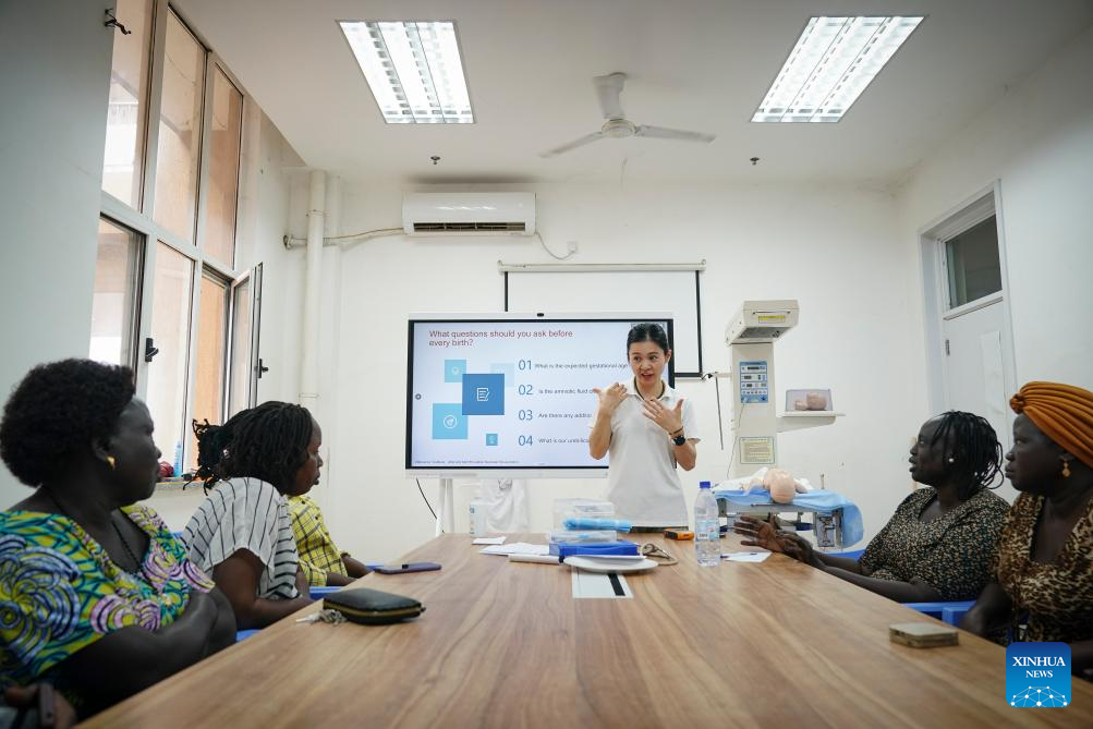 Zhu Juan (C), a doctor from the 11th batch of Chinese medical team to South Sudan, provides training on neonatal asphyxia resuscitation for local medical staff at Juba Teaching Hospital in Juba, South Sudan, on April 11, 2024. The 11th batch of Chinese medical team to South Sudan has been providing medical services at the Juba Teaching Hospital since September 2023. As of early April, 2024, the medical team had provided 6,873 outpatient and emergency services, completed 82 surgeries, organized six free treatment event, and provided professional training for over 1,100 local medical personnel. (Xinhua/Han Xu)