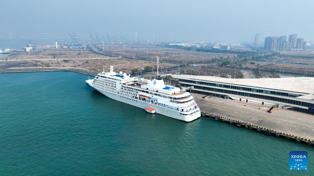 TIANJIN, April 13 (Xinhua) -- The Silver Shadow cruise ship, operated by the Royal Caribbean Group, docked at Tianjin International Cruise Home Port in north China's port city of Tianjin on Saturday morning, making it the third international cruise ship to visit Tianjin within a week.