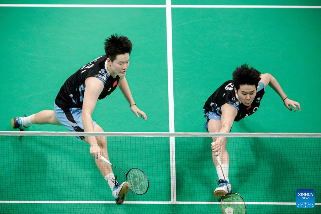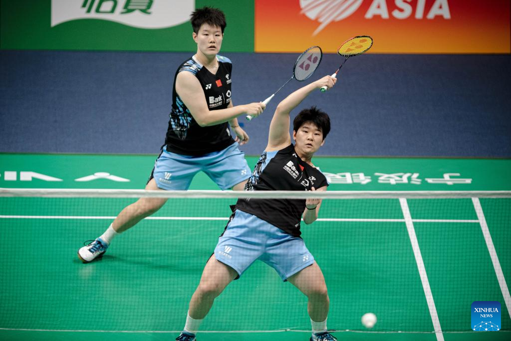Liu Shengshu/Tan Ning (L) of China compete during the women's doubles semifinal between Liu Shengshu/Tan Ning of China and Baek Ha Na/Lee So Hee of South Korea at Asia Championships 2024 badminton tournament in Ningbo, east China's Zhejiang Province, April 13, 2024. (Xinhua/Jiang Han)