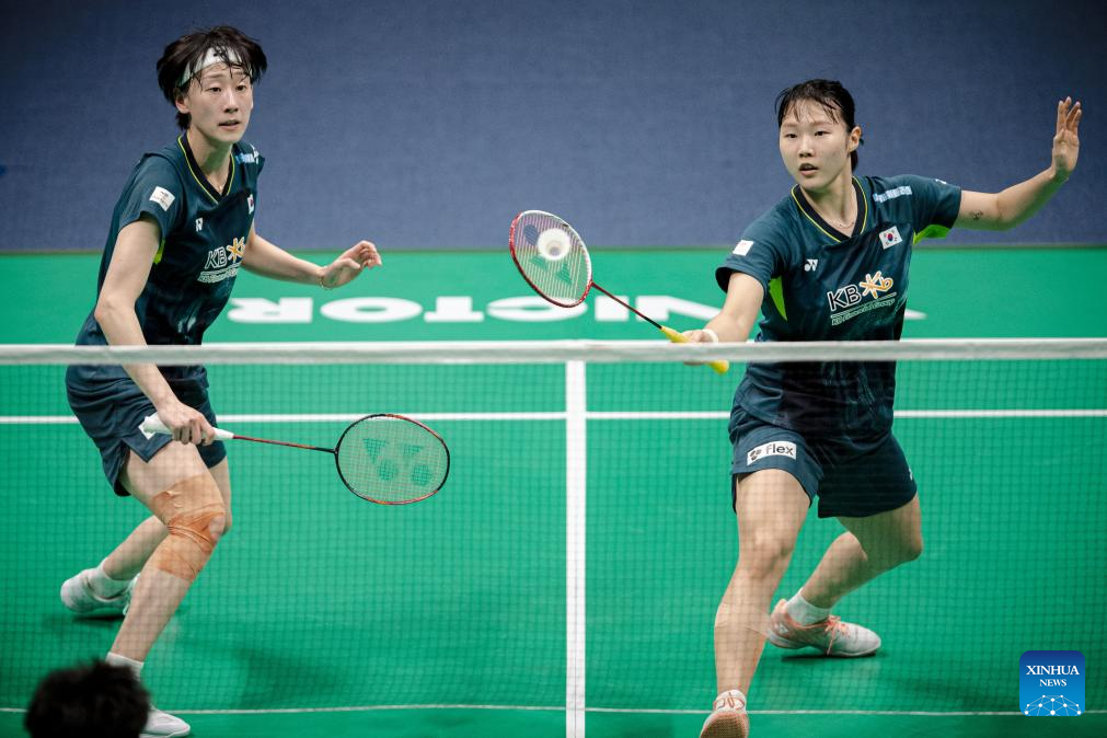 Baek Ha Na (R)/Lee So Hee of South Korea compete during the women's doubles semifinal between Liu Shengshu/Tan Ning of China and Baek Ha Na/Lee So Hee of South Korea at Asia Championships 2024 badminton tournament in Ningbo, east China's Zhejiang Province, April 13, 2024. (Xinhua/Jiang Han)