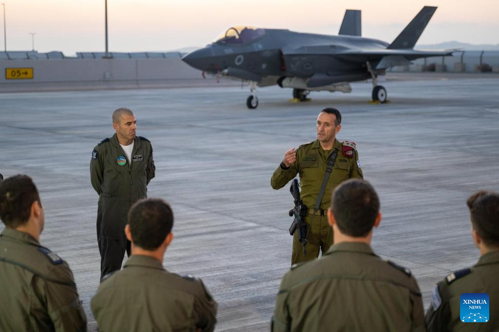 Herzi Halevi, chief of staff of the Israel Defense Forces, speaks during a meeting with pilots at the Nevatim Air Force base in southern Israel, on April 15, 2024. Herzi Halevi stated on Monday that a response is imminent following Iran's "unprecedented" missile and drone attack on Israel. (IDF/Handout via Xinhua)