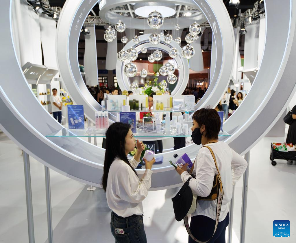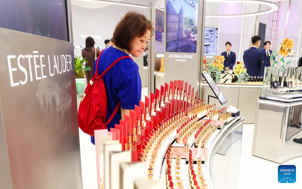 A visitor views cosmetic products at the fourth China International Consumer Products Expo (CICPE) in Haikou, capital city of south China's Hainan Province, April 15, 2024. The expo, which started Saturday and lasts till April 18, is China's only national-level exhibition featuring consumer products and also the largest consumer expo in the Asia-Pacific region. (Xinhua/Yang Guanyu)