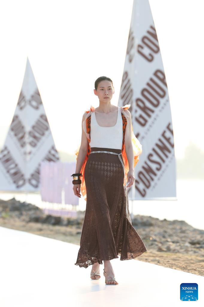 Models present creations during a fashion show at the fourth China International Consumer Products Expo (CICPE) in Haikou, capital city of south China's Hainan Province, April 15, 2024. The Expo, which started Saturday and lasts till April 18, is China's only national-level exhibition featuring consumer products and also the largest consumer expo in the Asia-Pacific region. (Xinhua/Li Mengjiao)