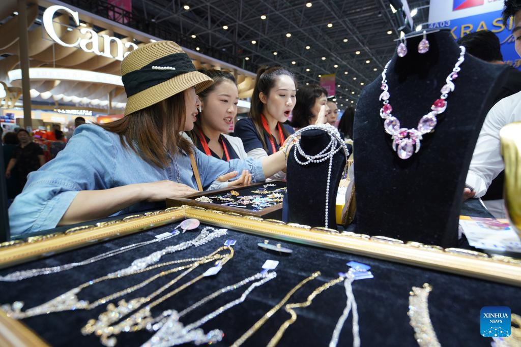 Visitors select jewelry at the fourth China International Consumer Products Expo (CICPE) in Haikou, capital city of south China's Hainan Province, April 13, 2024. The Expo, which started Saturday and lasts till April 18, is China's only national-level exhibition featuring consumer products and also the largest consumer expo in the Asia-Pacific region. (Xinhua/Guo Cheng)