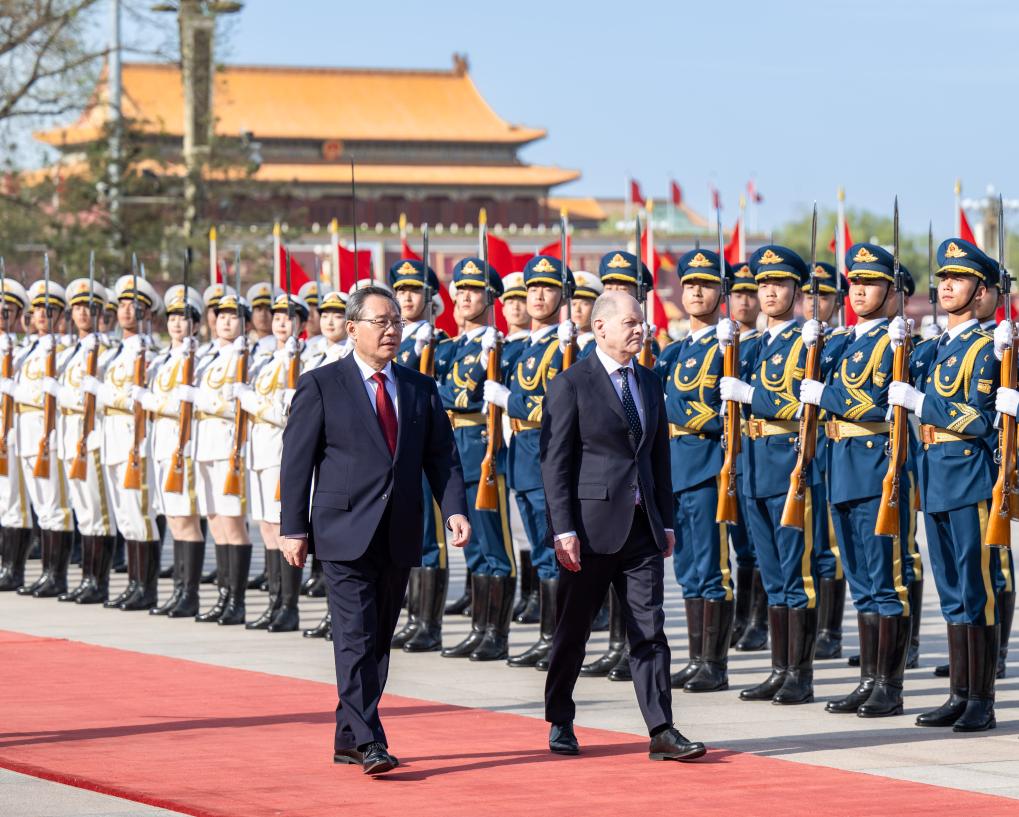 Chinese Premier Li Qiang holds a welcome ceremony for Federal Chancellor of Germany Olaf Scholz at the square outside the east entrance of the Great Hall of the People prior to their talks in Beijing, capital of China, April 16, 2024. Li held talks with Scholz in Beijing on Tuesday. (Xinhua/Zhai Jianlan)
