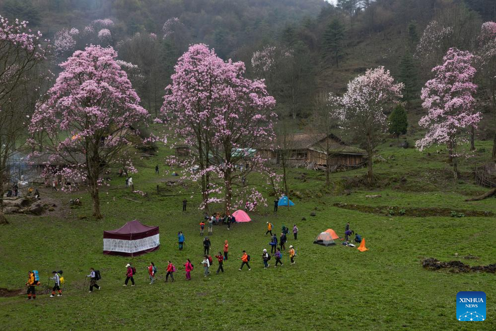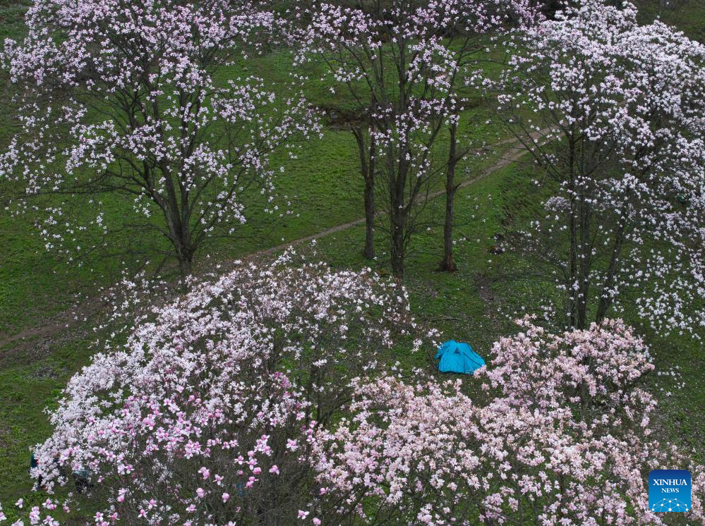 Tourists' tents are pictured under blooming magnolia flowers in Cangwangzhai Village of Yongsheng Town in Jiangyou, southwest China's Sichuan Province, April 14, 2024. (Xinhua/Jiang Hongjing)