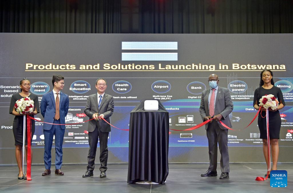 Botswanan Minister of Communications, Knowledge and Technology Thulagano Merafe Segokgo (2nd R) and representatives from Huawei attend a ceremony to launch Huawei products and solutions at the Huawei Telecom Congress 2024 in Gaborone, Botswana, on April 16, 2024. Authorities in Botswana have renewed their emphasis on the pivotal role of information, technology, and learning in driving economic success, and have called for cooperation among stakeholders. (Photo by Tshekiso Tebalo/Xinhua)