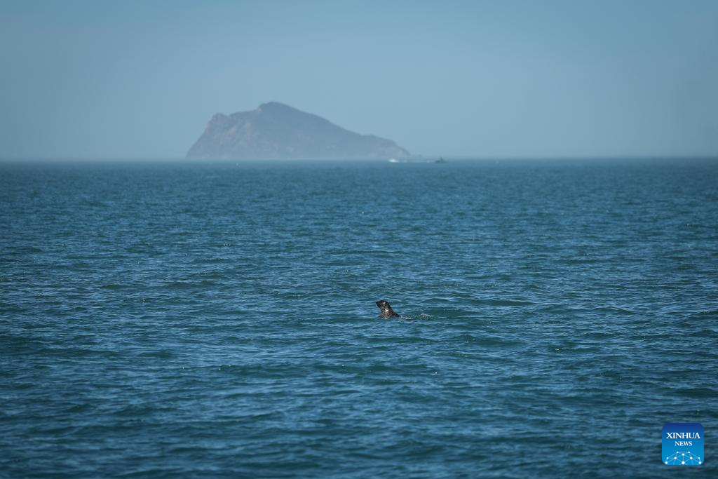 A spotted seal is released into the waters off Dalian, northeast China's Liaoning Province, April 16, 2024. (Xinhua/Pan Yulong)