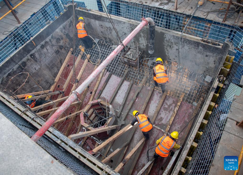 Laborers work at the construction site of Zhongxiang Hanjiang grand bridge in Jingmen, central China's Hubei Province, April 16, 2024. The No. 316 main tower of Zhongxiang Hanjiang grand bridge was successfully capped on Tuesday. The grand bridge is a key project of the Wuhan-Yichang section of a high-speed railway linking east China's Shanghai, southwest China's Chongqing and Chengdu of southwest China's Sichuan Province. (Xinhua/Du Zixuan)