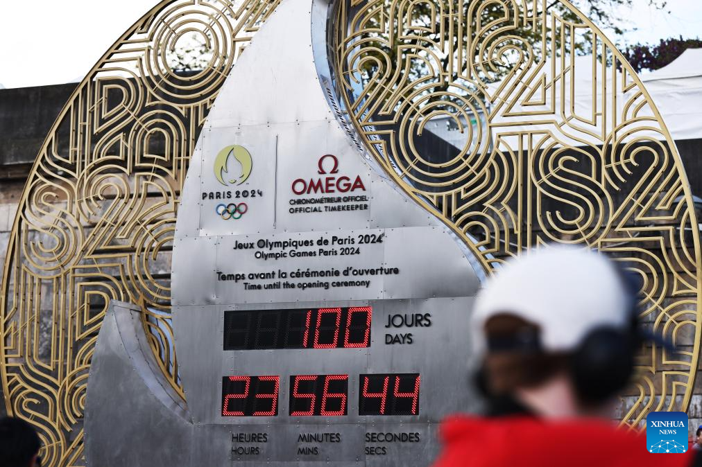 This photo taken on April 16, 2024 shows a countdown clock for the Paris 2024 Olympic Games in front of the Eiffel Tower in Paris, France. (Xinhua/Gao Jing)