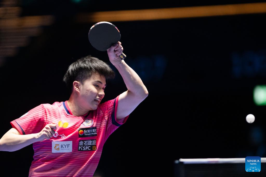 Lin Yun-ju of Chinese Taipei hits a return during the men's singles match against Matsushima Sora of Japan at the ITTF World Cup Macao 2024 at Galaxy Arena in Macao, China, April 17, 2024. (Xinhua/Cheong Kam Ka)