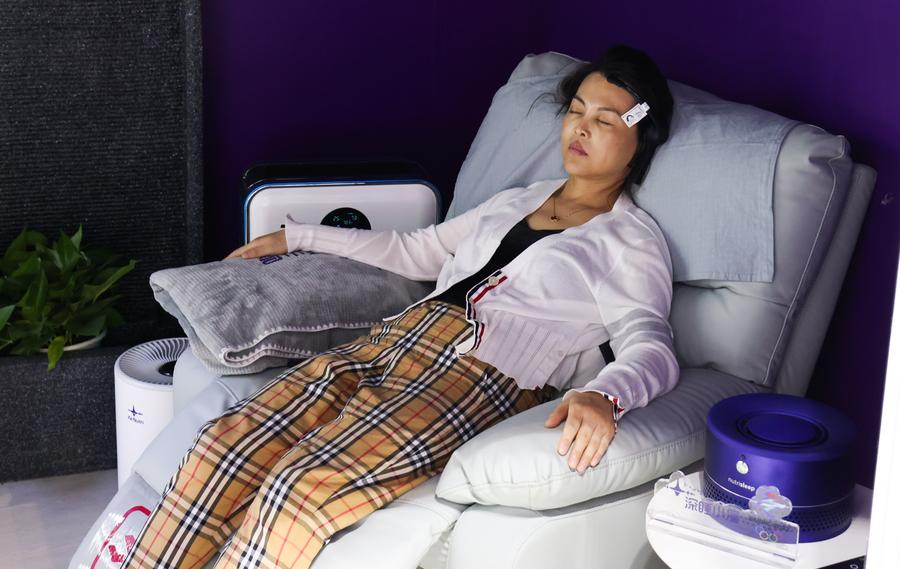 A visitor tries a sleep aid device at the fourth China International Consumer Products Expo (CICPE) in Haikou, capital city of south China's Hainan Province, April 16, 2024. (Xinhua/Yang Guanyu)
