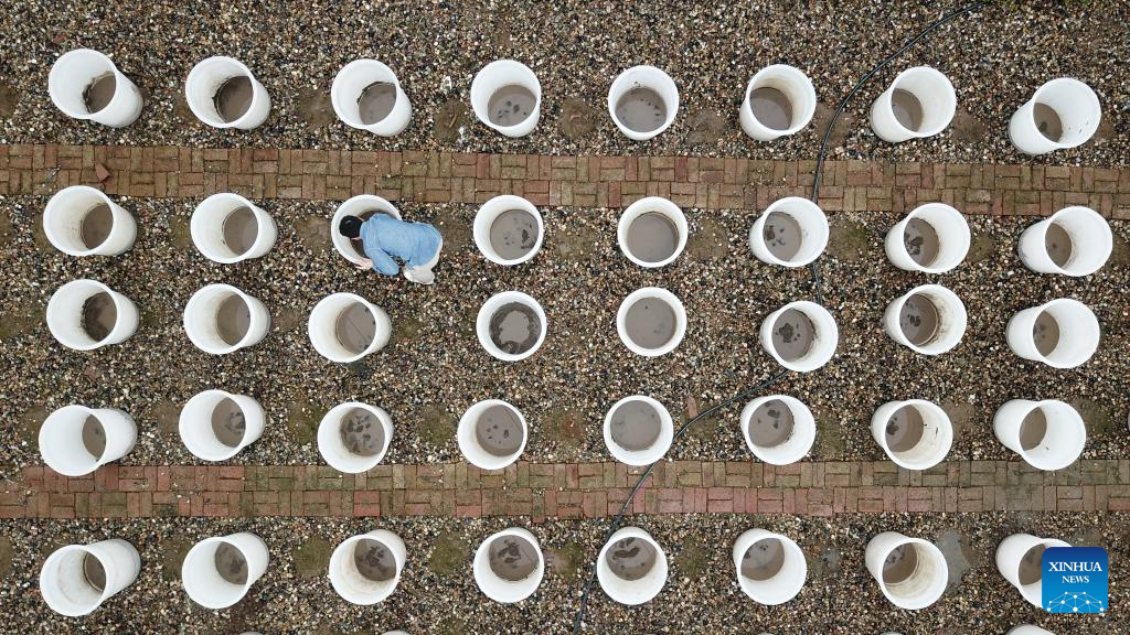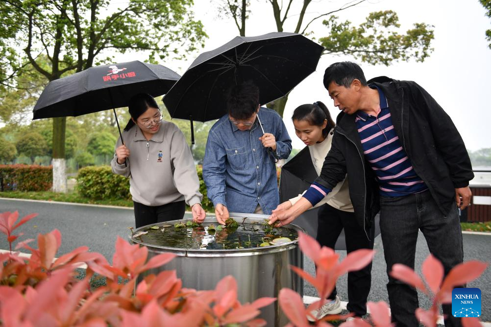 Li Yang (2nd L) checks the growth of aquatic plants at Datong Lake aquatic plants industrial demonstration park in Yiyang, central China's Hunan Province, April 11, 2024. (Xinhua/Chen Zhenhai)