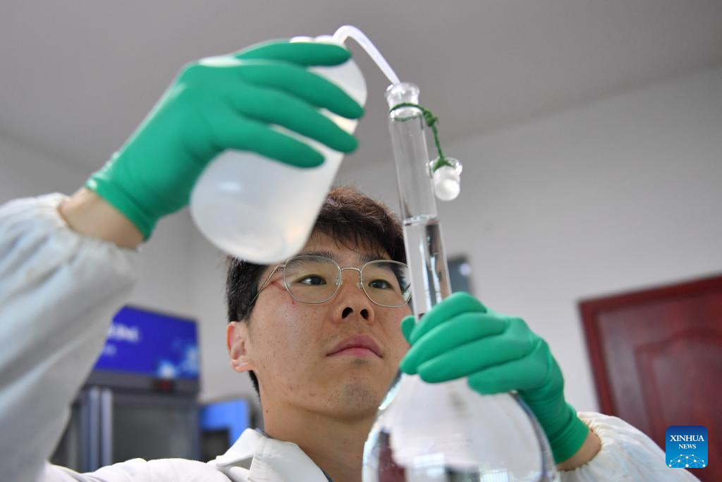 Li Yang processes reagents at a laboratory in the workstation at Datong Lake in Yiyang, central China's Hunan Province, April 11, 2024. (Xinhua/Chen Zhenhai)