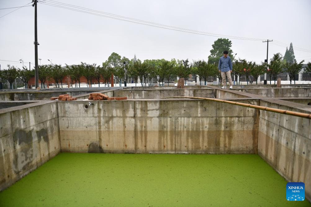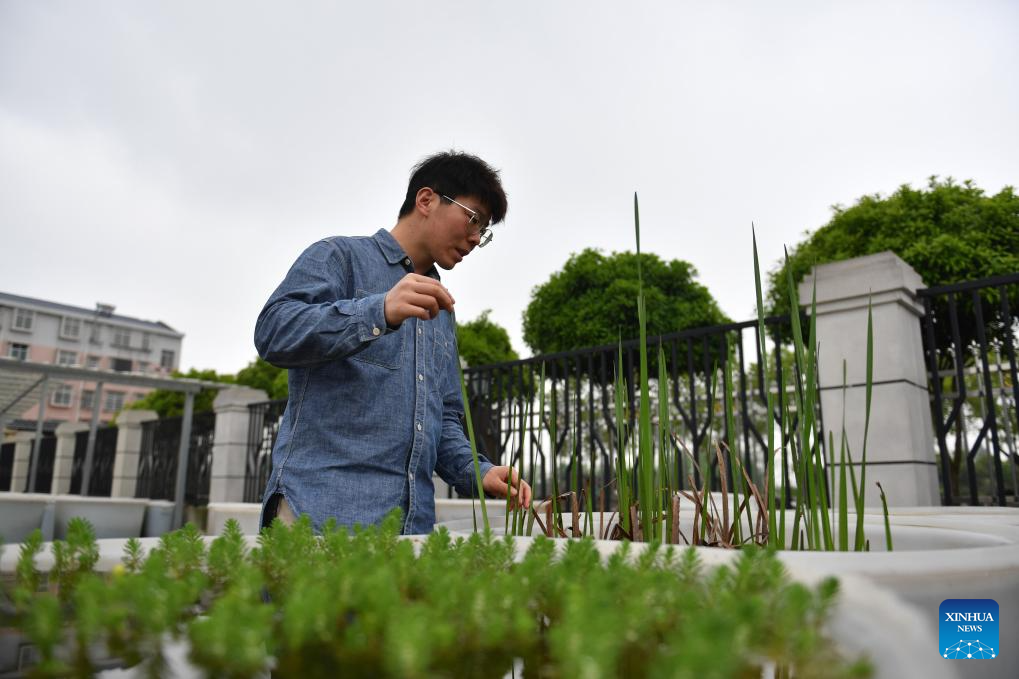 Li Yang checks the condition of aquatic plants at the workstation at Datong Lake in Yiyang, central China's Hunan Province, April 11, 2024. (Xinhua/Chen Zhenhai)