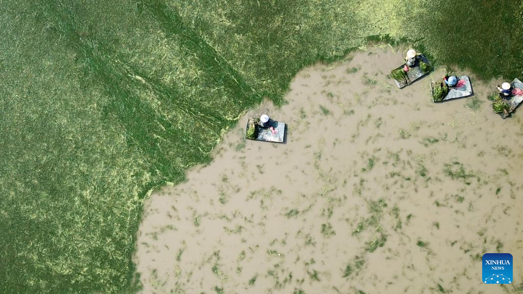 An aerial drone photo taken on April 20, 2023 shows workers collecting aquatic plants at Datong Lake aquatic plants industrial demonstration park in Yiyang, central China's Hunan Province. (Xinhua/Chen Zhenhai)
