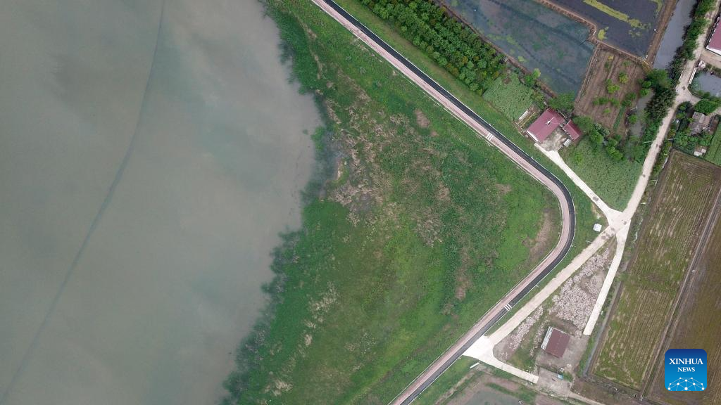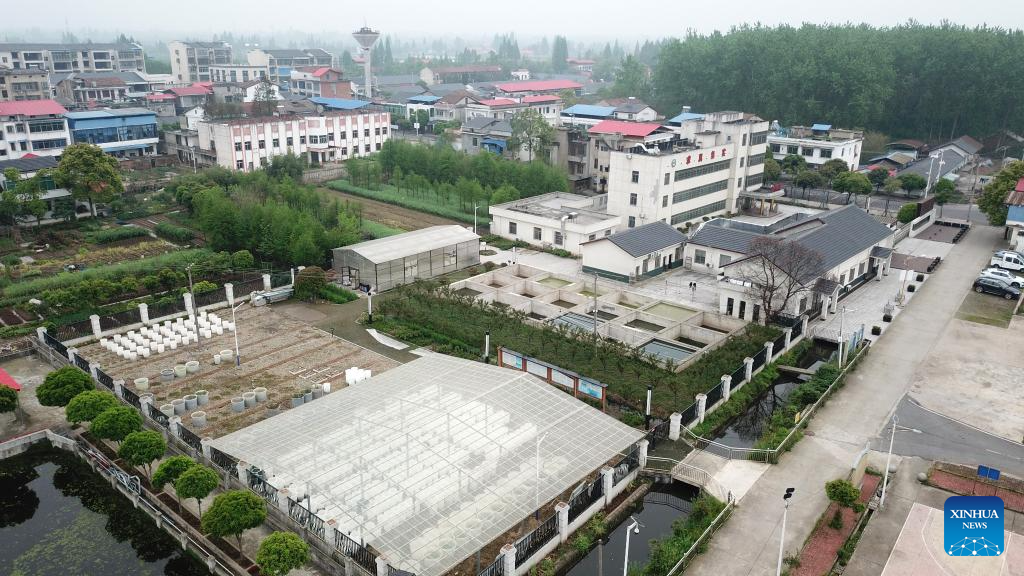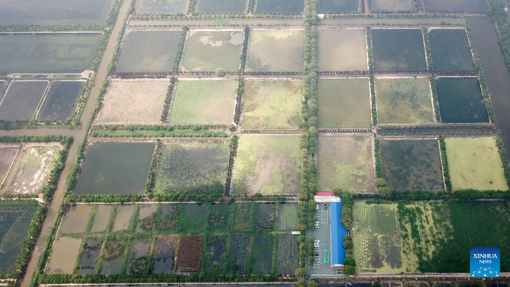 An aerial drone photo taken on April 20, 2023 shows a view of Datong Lake aquatic plants industrial demonstration park in Yiyang, central China's Hunan Province. (Xinhua/Chen Zhenhai)