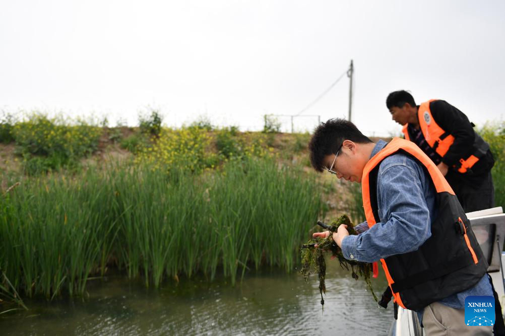 Li Yang (front) checks the growth of aquatic plants at Datong Lake in Yiyang, central China's Hunan Province, April 11, 2024. (Xinhua/Chen Zhenhai)