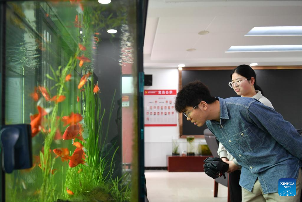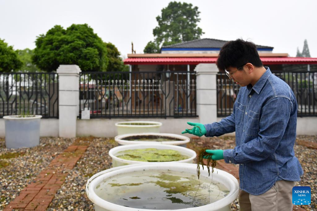 Li Yang shows the aquatic plants at the workstation at Datong Lake in Yiyang, central China's Hunan Province, April 11, 2024. (Xinhua/Chen Zhenhai)