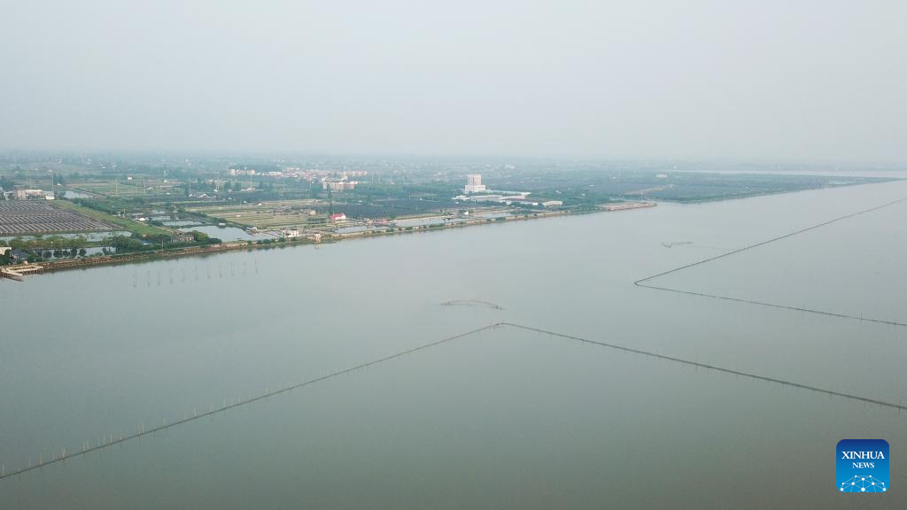 An aerial drone photo taken on April 11, 2024 shows the workstation at Datong Lake in Yiyang, central China's Hunan Province. (Xinhua/Chen Zhenhai)?