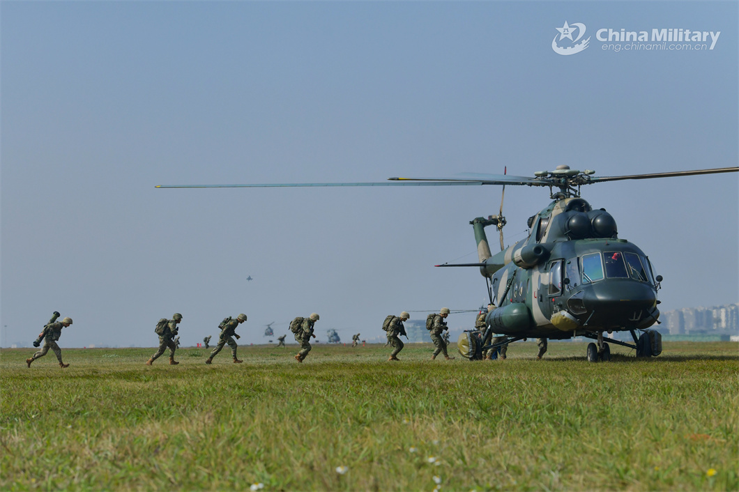 Fully-armed soldiers assigned to a brigade of the PLA 73rd Group Army line up to board a helicopter during a coordination training exercise with an army aviation unit in mid-March, 2024. (eng.chinamil.com.cn/Photo by Zhu Wanfu)