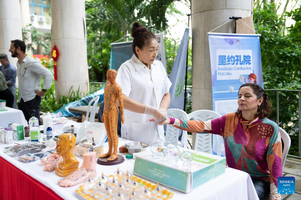 A woman experiences traditional Chinese medicine treatment during an event marking the United Nations Chinese Language Day in Rio de Janeiro, Brazil, on April 18, 2024. The Pontifical Catholic University of Rio de Janeiro in Brazil hosted the event on Thursday, attracting a large number of spectators to experience the Chinese culture. (Xinhua/Wang Tiancong)