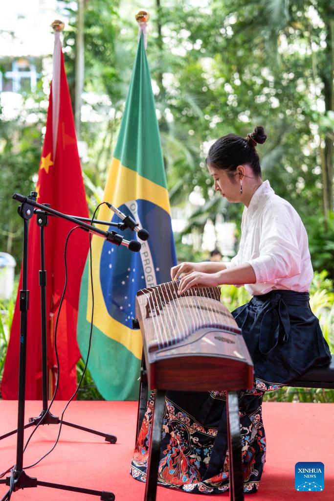 A teacher from the Confucius Institute of Pontifical Catholic University of Rio de Janeiro performs the guzheng, a traditional Chinese musical instrument, during an event marking the United Nations Chinese Language Day in Rio de Janeiro, Brazil, on April 18, 2024. The Pontifical Catholic University of Rio de Janeiro in Brazil hosted the event on Thursday, attracting a large number of spectators to experience the Chinese culture. (Xinhua/Wang Tiancong)