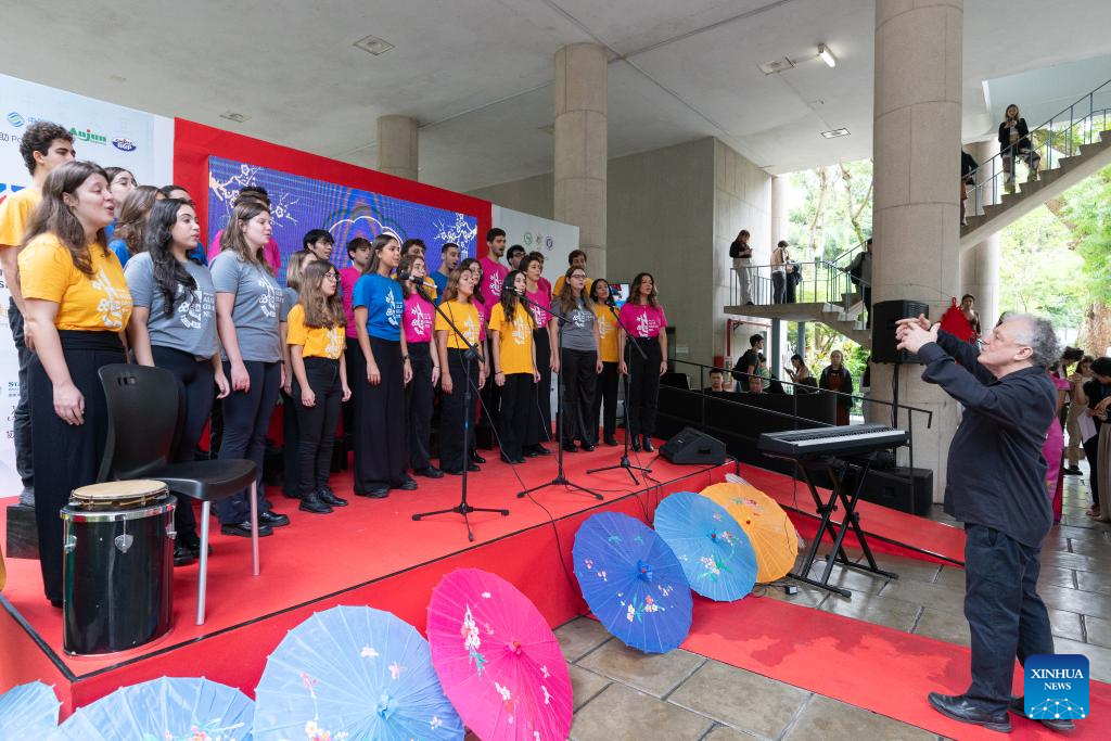 A Brazilian student choir performs during an event marking the United Nations Chinese Language Day in Rio de Janeiro, Brazil, on April 18, 2024. The Pontifical Catholic University of Rio de Janeiro in Brazil hosted the event on Thursday, attracting a large number of spectators to experience the Chinese culture. (Xinhua/Wang Tiancong)
