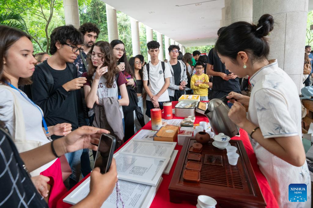 Brazilian students taste Chinese tea during an event marking the United Nations Chinese Language Day in Rio de Janeiro, Brazil, on April 18, 2024. The Pontifical Catholic University of Rio de Janeiro in Brazil hosted the event on Thursday, attracting a large number of spectators to experience the Chinese culture. (Xinhua/Wang Tiancong)