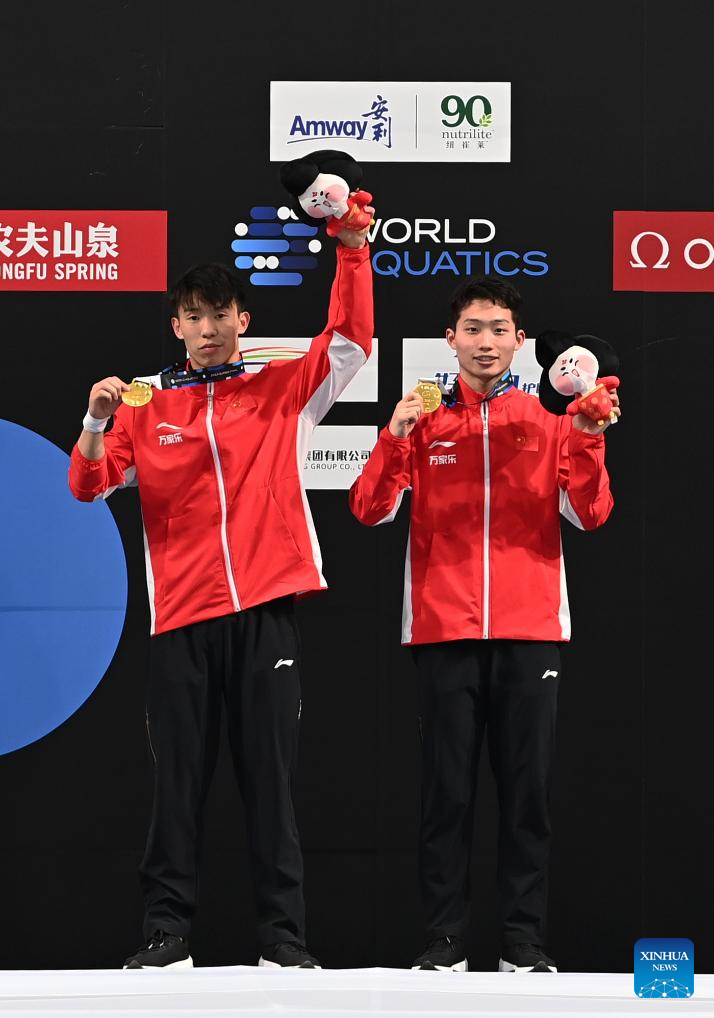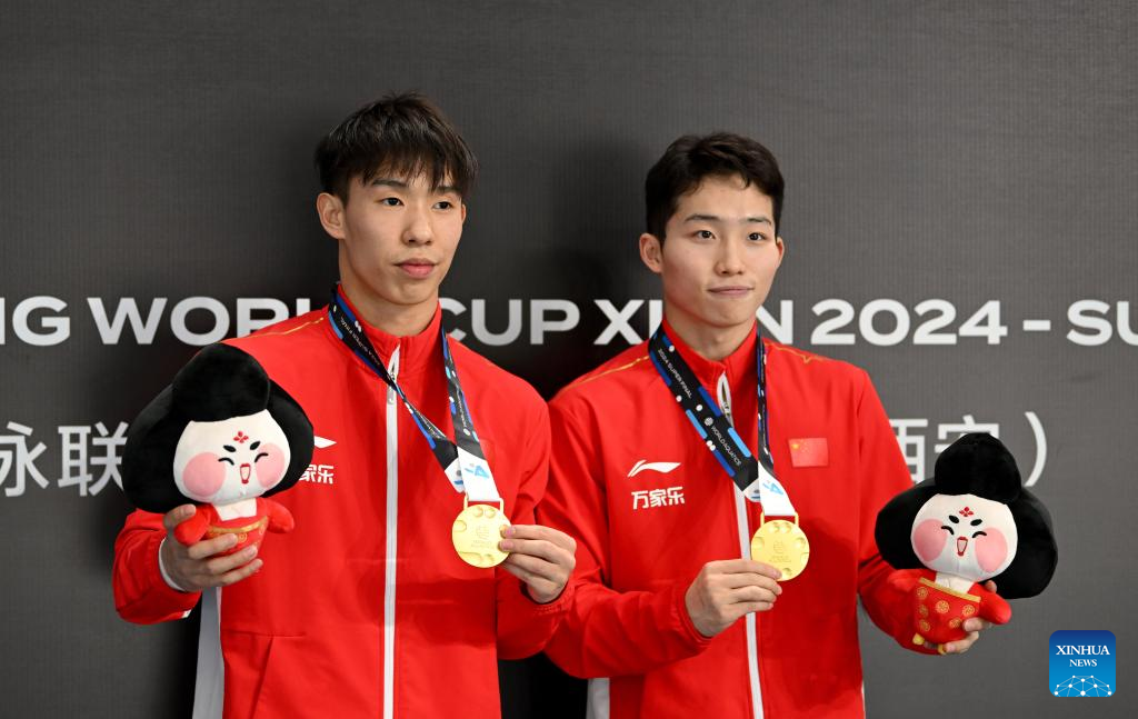 Gold medalists Long Daoyi and Wang Zongyuan (R) of China pose after the awarding ceremony for the men's 3m synchronised at the World Acquatics Diving World Cup 2024 Super Final Stop 1 in Xi'an, northwest China's Shaanxi Province, April 19, 2024. (Xinhua/Zou Jingyi)