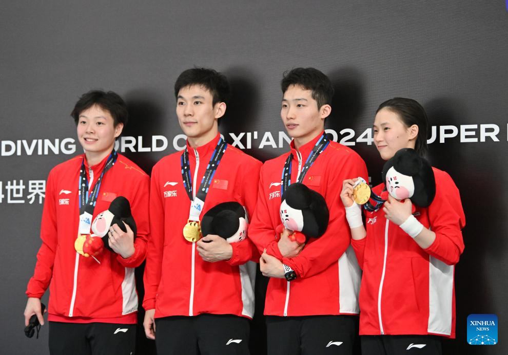 Gold medalists Chen Yiwen, Yang Hao, Wang Zongyuan and Chen Yuxi (from L to R) of China pose after the awarding ceremony for the mixed 3m &10m team event at the World Acquatics Diving World Cup 2024 Super Final Stop 1 in Xi'an, northwest China's Shaanxi Province, April 19, 2024. (Xinhua/Zhang Bowen)