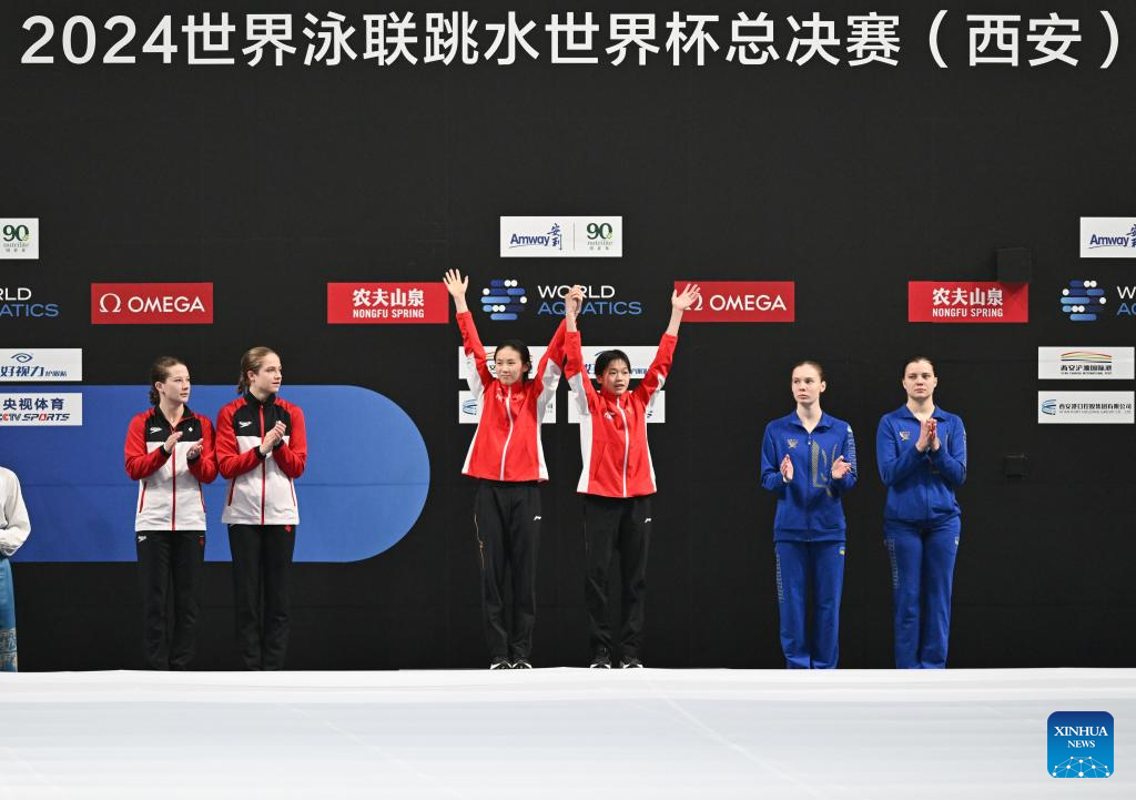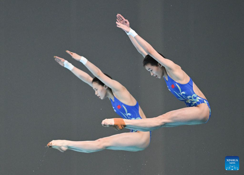 Quan Hongchan (R)/Chen Yuxi of China compete during the women's 10m synchronised final at the World Acquatics Diving World Cup 2024 Super Final Stop 1 in Xi'an, northwest China's Shaanxi Province, April 19, 2024. (Xinhua/Zhang Bowen)