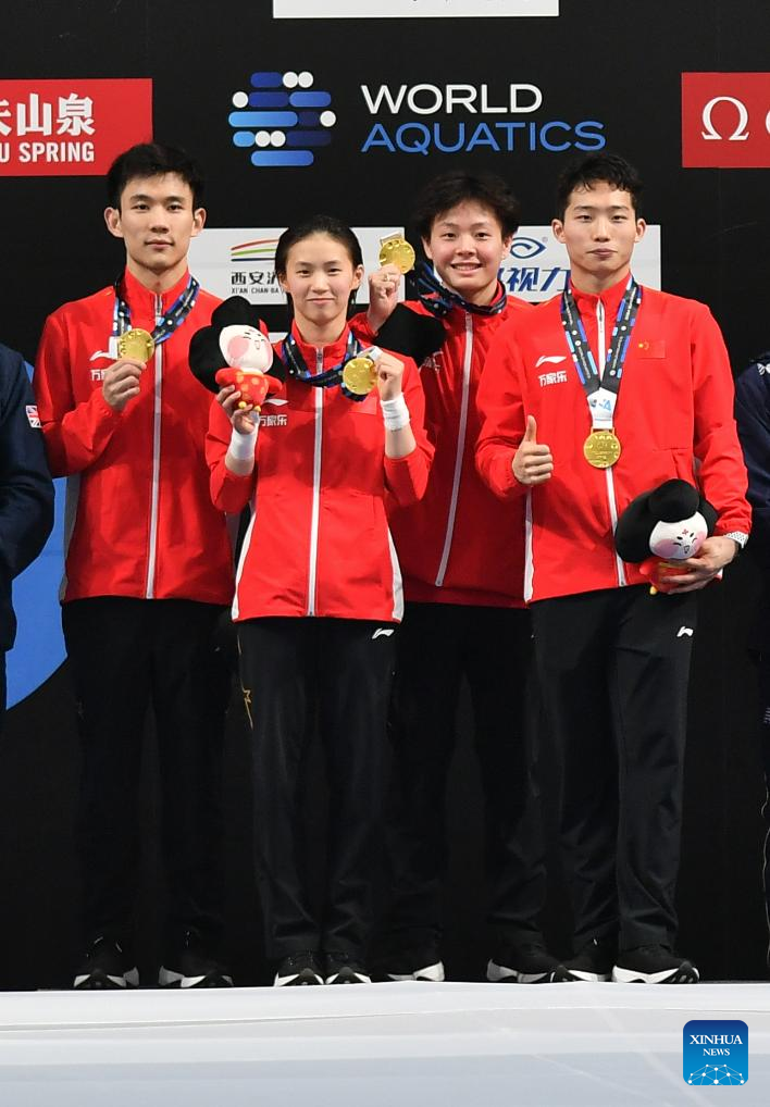 Gold medalists Yang Hao, Chen Yuxi, Chen Yiwen and Wang Zongyuan (from L to R) of China pose during the awarding ceremony of the mixed 3m &10m team event at the World Acquatics Diving World Cup 2024 Super Final Stop 1 in Xi'an, northwest China's Shaanxi Province, April 19, 2024. (Xinhua/Zhang Bowen)