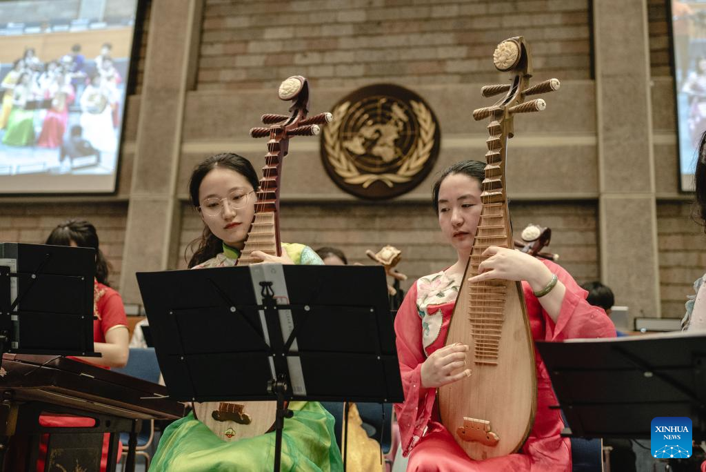 Members of an instrument orchestra of east China's Nanjing University perform during a UN Chinese Language Day event in Nairobi, Kenya, April 19, 2024. The United Nations Office in Nairobi (UNON) and the Chinese Embassy in Kenya celebrated UN Chinese Language Day on Friday with a vibrant event which included calligraphy, lectures and a musical performance. The ceremony featured traditional music from the instrument orchestra of east China's Nanjing University and was attended by senior UN officials, diplomats, students and faculty members from local universities. (Xinhua/Wang Guansen)