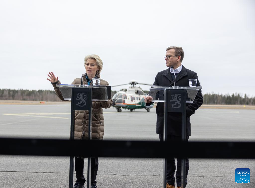 European Commission President Ursula von der Leyen (L) and Finnish Prime Minister Petteri Orpo attend a press conference at Lappeenranta airport, southeastern Finland, on April 19, 2024. European Commission President Ursula von der Leyen and Finnish Prime Minister Petteri Orpo on Friday urged de-escalation amid Iran-Israel tensions. (Lauri Heikkinen/Prime minister's office/Handout via Xinhua)