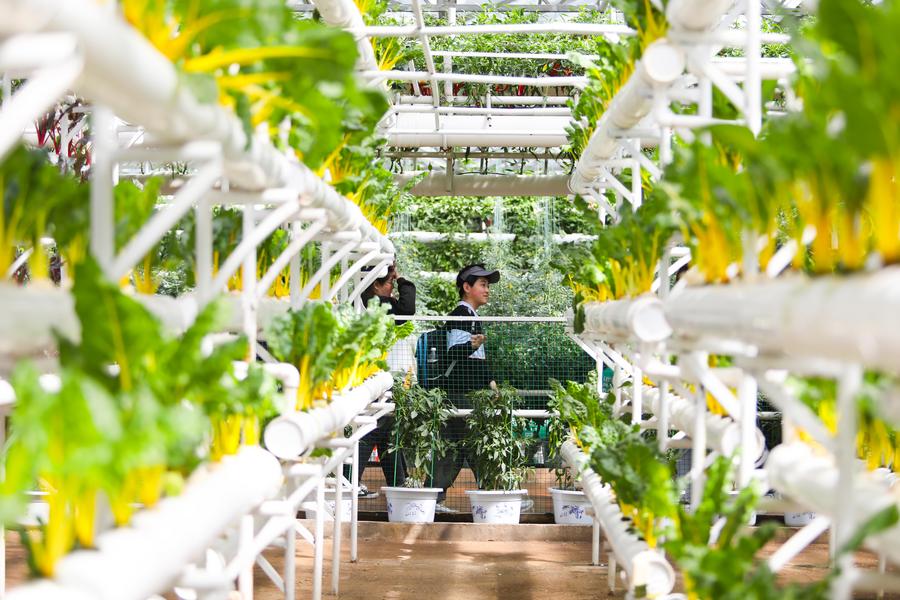 A woman visits a soilless cultivation greenhouse at the 25th China (Shouguang) International Vegetable Science and Technology Expo in Shouguang, east China's Shandong Province, April 21, 2024. (Xinhua/Xu Suhui)
