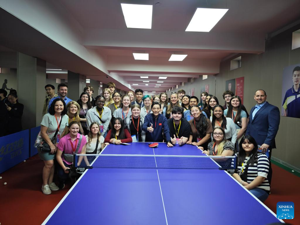 American students and teachers pose for a group photo with Chinese hosts after playing ping pong at Shijiazhuang Foreign Language School in Shijiazhuang, north China's Hebei Province, April 20, 2024. (Xinhua/Bai Lin)