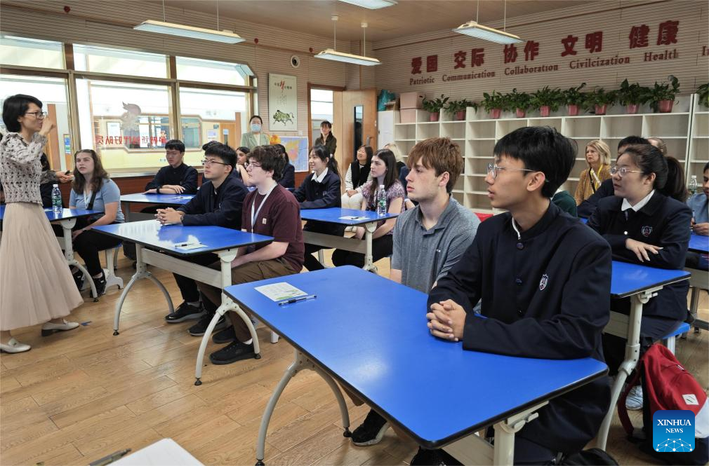 A teacher introduces the ancient poem "Rural Life" to Chinese and American students at Shijiazhuang Foreign Language School in Shijiazhuang, north China's Hebei Province, April 20, 2024. (Xinhua/Bai Lin)