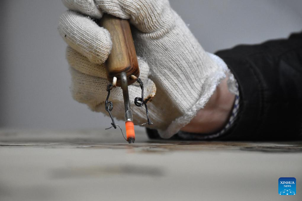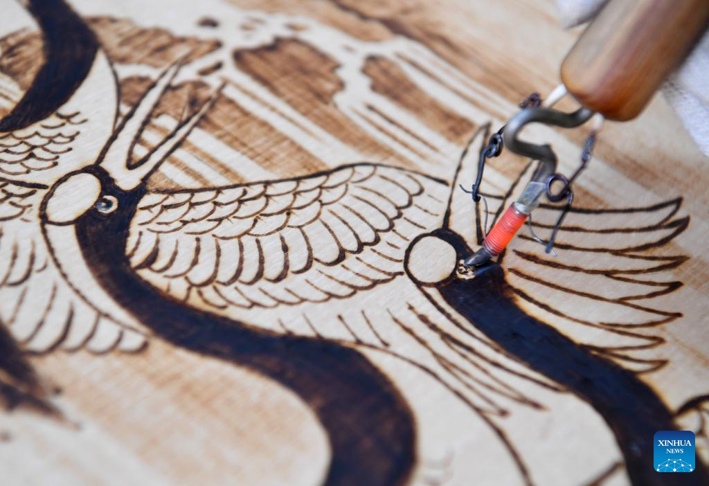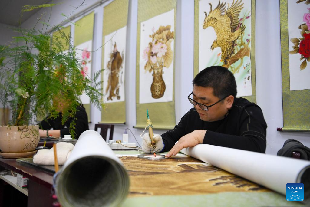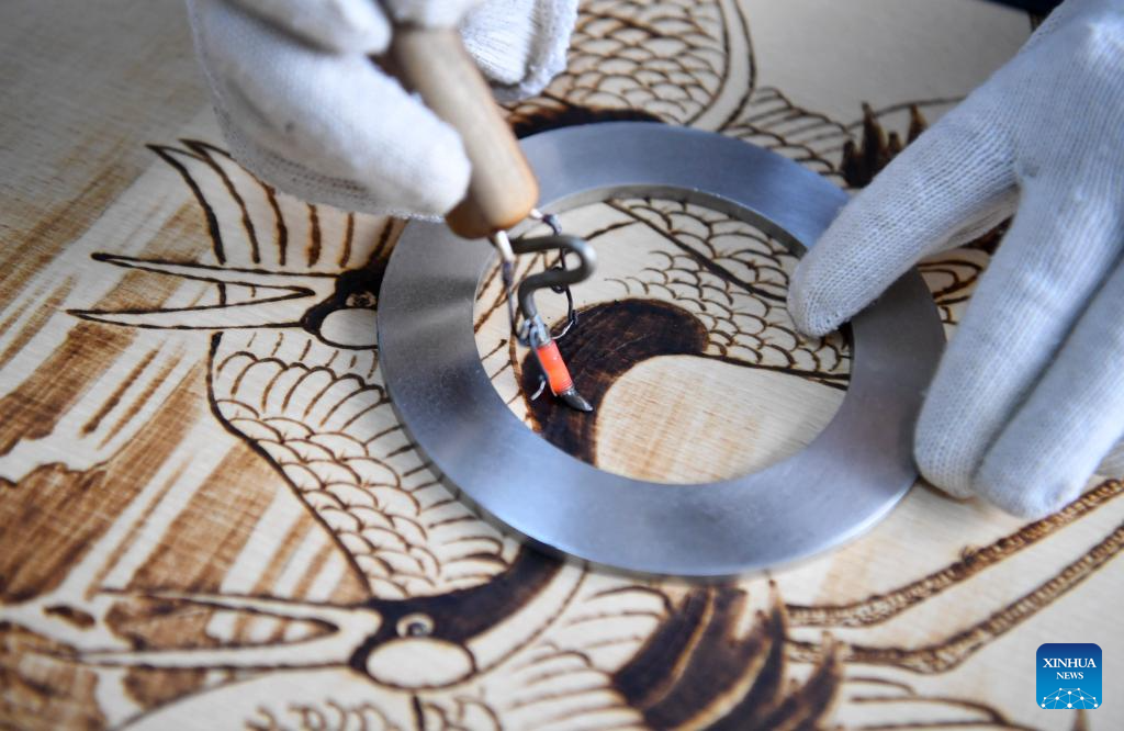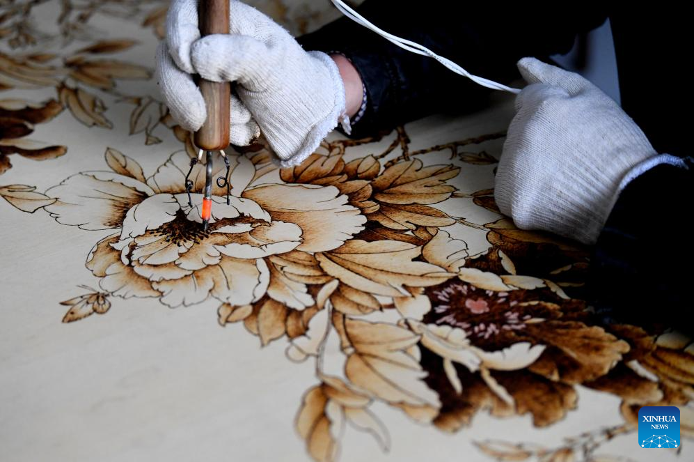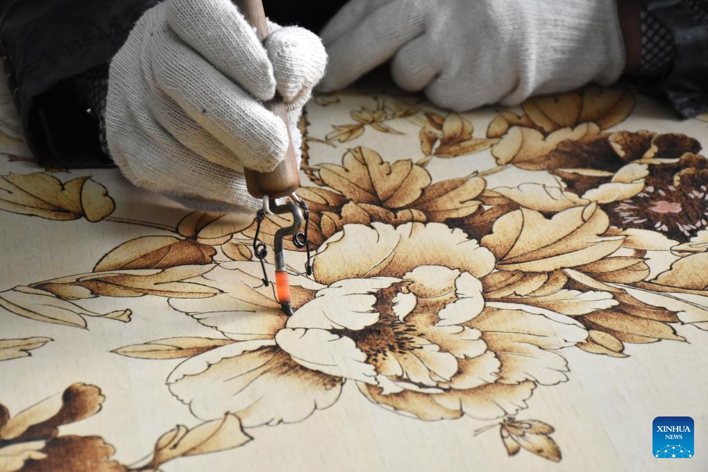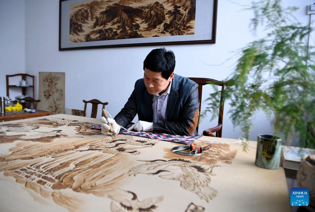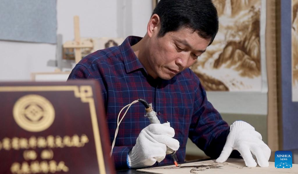 A lover of Nanyang pyrography makes an artwork of pyrography at a studio of Nanyang Pyrography Factory in Nanyang City, central China's Henan Province, March 14, 2024. (Xinhua/Gao Songling)